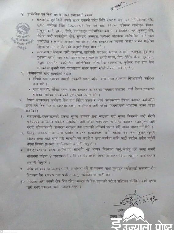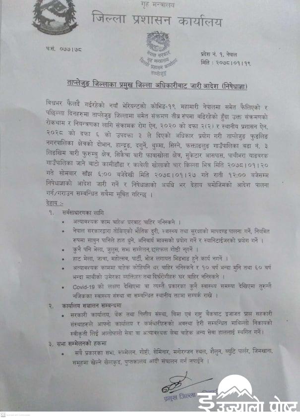 ताप्लेजुङमा सोमबार साँझबाटै निषेधाज्ञा लागु हुने, अटेर गर्नेलाई कारबाहीको तयारी