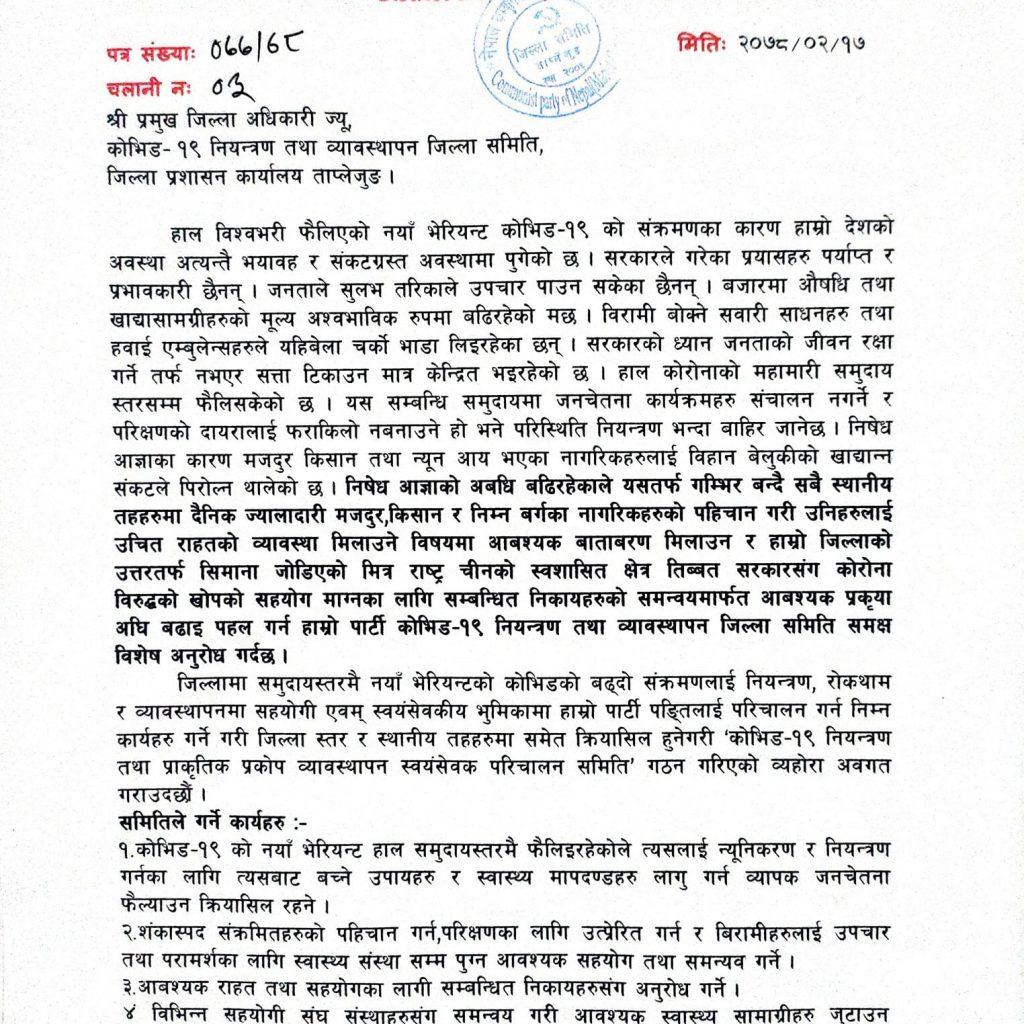 माओवादीले ताप्लेजुङमा कोरोना रोकथाम तथा नियन्त्रण गर्न सघाउने