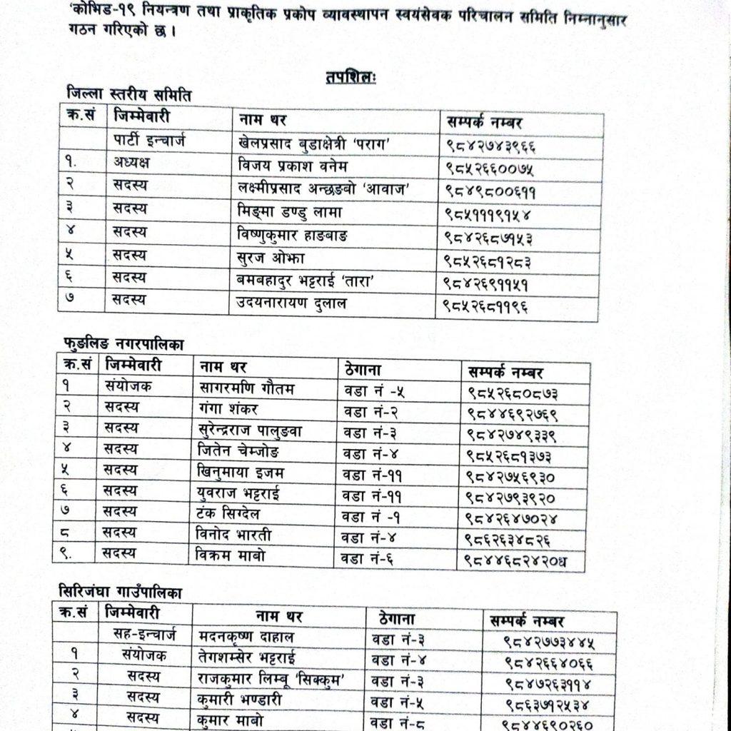 जिल्ला स्तरमा पार्टी इन्चार्ज खेलप्रसाद बुढाक्षेकी (पराग) र जिल्ला अध्यक्ष विजयप्रकाश वनेम रहेको समिति चयन गरिएको छ । समिति सदस्यहरुमा लक्ष्मीप्रसाद अन्छङ्बो, मिड्माडण्डु शेर्पा, विष्णुकुमार हाङबाङ, सुरज ओझा, बमबहादुर भट्टराई र उदयनारायण दुलाल रहुनभएको छ । यस्तै पालिकास्तरमा फुङलिङ नगरपालिकामा सागर गौतमको संयोजकत्वमा नौ सदस्यीय, सिरिजंघा गाउँपालिकामा तेजसम्सेर भट्टराई (काजी) को संयोजकत्वमा आठ सदस्यीय समिति बनेको छ ।