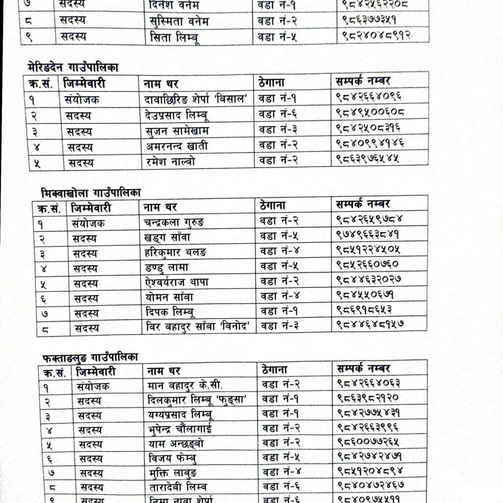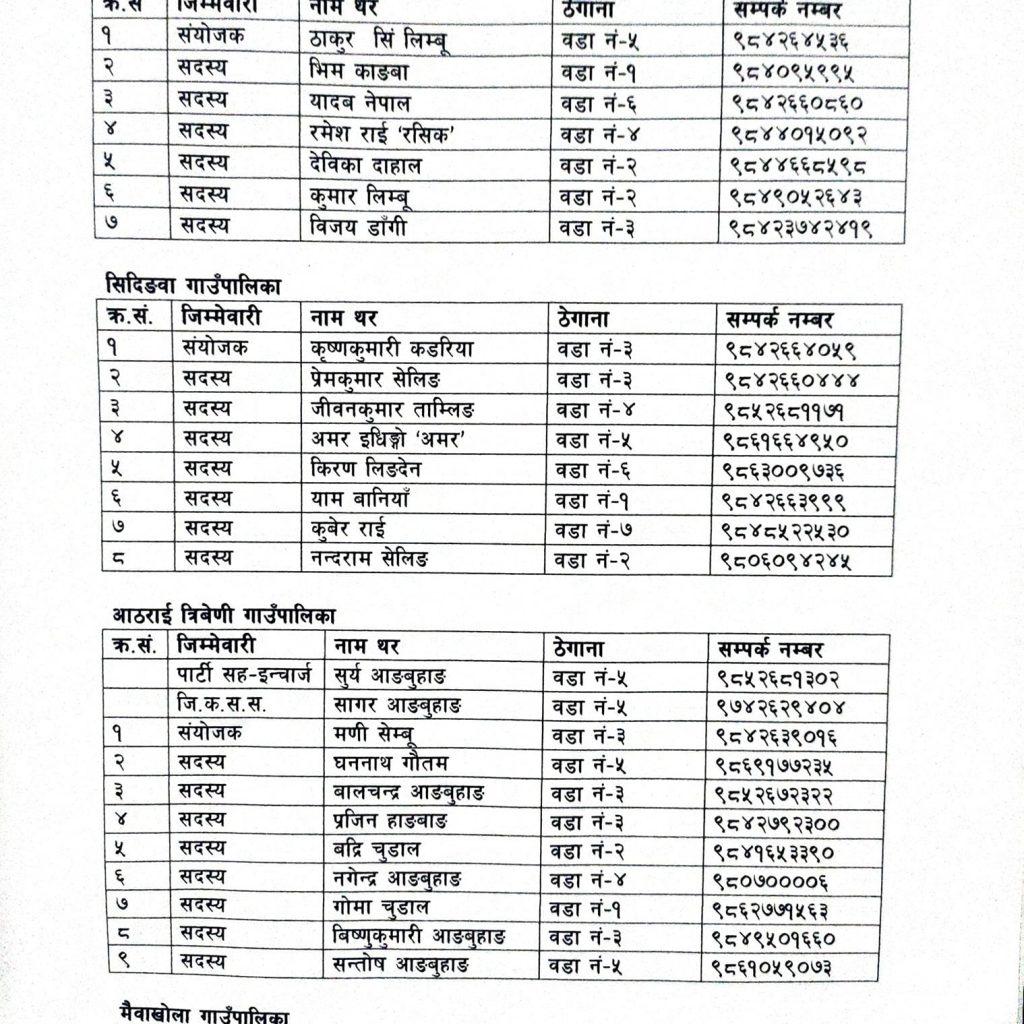 पाथीभरा याङ्वरक गाउँपालिकामा ठाकुर लिम्बूको संयोजकत्वमा सात सदस्यीय, सिदिङ्वा गाउँपालिकामा कृष्णकुमारी कडरिया (बन्दना) को संयोजकत्वमा आठ सदस्यीय, आठराई त्रिबेणी गाउँपालिकामा मणि सेम्बुको संयोजकत्वमा नौ सदस्यीय समिति चयन गरिएको छ । त्यस्तै मैवाखोला गाउँपालिकामा आलोक शेर्पाको संयोजकत्वमा नौ सदस्यीय, मेरिङ्देन गाउँपालिकामा दावछिरिङ शेर्पा (विशालु) को संयोजकत्वमा पाँच सदस्यीय, मिक्वाखोला गाउँपालिकामा चन्द्रकला गुरुङको संयोजकत्वमा आठ सदस्यीय र फक्ताङ्लुङ गाउँपालिकामा मानबहादुर केसीको संयोजकत्वमा स्वयंसेवक परिचालन समिति निर्माण गरिएको छ । केही स्थानीय तहहरुमाका समितिअन्तर्गत इन्चार्जको जिम्मेवारी पनि तोकिएको माओवादी केन्द्रले जनाएको छ ।