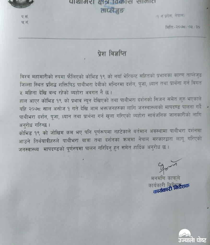 ताप्लेजुङ,भदौ ३० । पूर्वकै पवित्र शक्तिपीठ ताप्लेजुङमा अवस्थित पाथीभरा मन्दिर असोज १ गतेबाट दर्शनका लागि खुल्ला गरिने भएको छ । पाथीभरा क्षेत्र विकास समितिले बुधवार प्रेश बिज्ञप्ती जारी गर्दै असोज १ गतेबाट जनस्वास्थ्यका मापदण्डको पूर्ण पालना गर्ने शर्तमा आम भक्तजनका लागि मन्दिरमा दर्शन,पूजा,ध्यान तथा प्रार्थना गर्न खुल्ला गरिएको जनाएको छ । पाथीभरा क्षेत्र विकास समितिका कार्यकारी निर्देशक मनमणि काफ्लेले अनुसार कोभिड–१९ को प्रभाव केहि न्यून देखिएको तथा पाथीभरा दर्शनको सिजन समेत सुरु भएको अवस्थालाइ ध्यानमा राखी मन्दिरमा दर्शन,पूजा,ध्यान तथा प्रार्थना गर्न खुल्ला गरिएको जानकारी दिनुभयो ।
