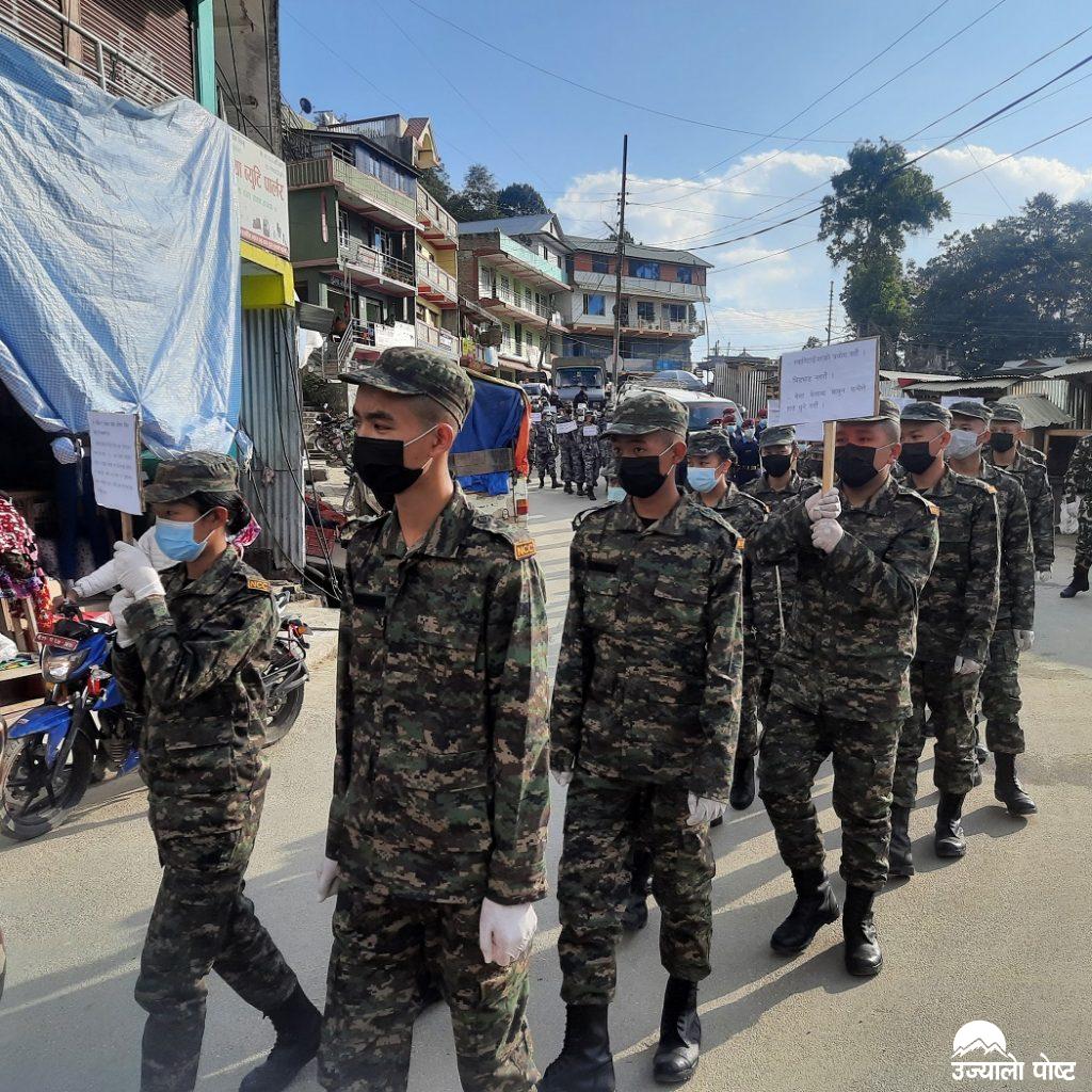 ताप्लेजुङ,मंसिर २१ । कोरोना संक्रमणको तेस्रो भेरिएन्ट ‘ओमिक्रोन’बिरुद्ध सचेतना अपनाउन आग्रह गर्दै ताप्लेजुङस्थित भीमकाली गुल्मको अगुवाइमा मंगलवार फुङ्लिङमा जनचेतनामुलक ¥याली निकालिएको छ । नेपाली सेना,नेपाल प्रहरी,शसस्त्र प्रहरी र सदरमुकामस्थित लिटलबुद्ध आवासीय माविमा तालिमरत राष्ट्रिय सेवा दल(एनसीसी)मा आबद्धहरुको सहभागितामा जनचेतनामुलक ¥याली निकालिएको हो । तोक्मेडाँडाबाट सुरु भएको ¥याली टुक्रे हुँदै माथिल्लो रोडबाट फेरी तोक्मेडाँडामा पुगेर सकिएको थियो । जनस्वास्थ्य सुरक्षाका मापदण्डको पूर्ण पालनाले मात्र संक्रमणको जोखिमबाट बच्न सकिने भएकोले त्यहिँ सन्देश प्रवाहका लागि जनचेतनामुलक ¥याली निकालिएका भीमकाली गुल्मका गुल्मपति सेनानी राजन बस्नेतले बताउनुभयो । ¥यालीमा मास्क तथा स्यानीटाइजरको अनिवार्य प्रयोग गर्न,भिडभाडमा नजान,पटक–पटक साबुन पानीले हात धुन,अत्यावश्यक काम बाहेक घर बाहिर नजान,भौतिक दुरी कायम गर्न र कोरोना बिरुद्धको खोप अनिवार्य रुपमा प्रयोग गर्न आग्रह गरिएको थियो ।