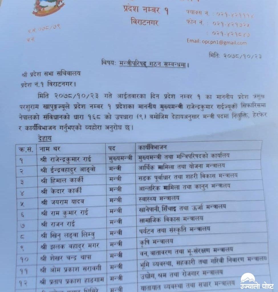 प्रदेश १ को १४ सदस्यीय मन्त्रिपरिषद्मा आइतबार नियुक्त भएका ८ मन्त्रीमध्ये दुई मन्त्रीको मन्त्रालय फेरिएको छ । सपथ ग्रहण स्थलमै मन्त्रीहरूको मन्त्रालय फेरिएको हो । सपथ ग्रहणका क्रममा सडक पूर्वाधार तथा सहरी विकास मन्त्री हिमाल कार्कीले मन्त्रीको नाम र मन्त्रालय फरक परेको भन्दै सच्याउन माग गर्नु भएको थियो । कर्यविभाजनमा उद्योग, श्रम तथा रोजगार मन्त्रालयको जिम्मेवारी तोकिनु भएका ओमप्रकाश सरावगीलाई भूमी व्यवस्था, सहकारी तथा गरिबी निवारण मन्त्री बनाइएको छ ।
