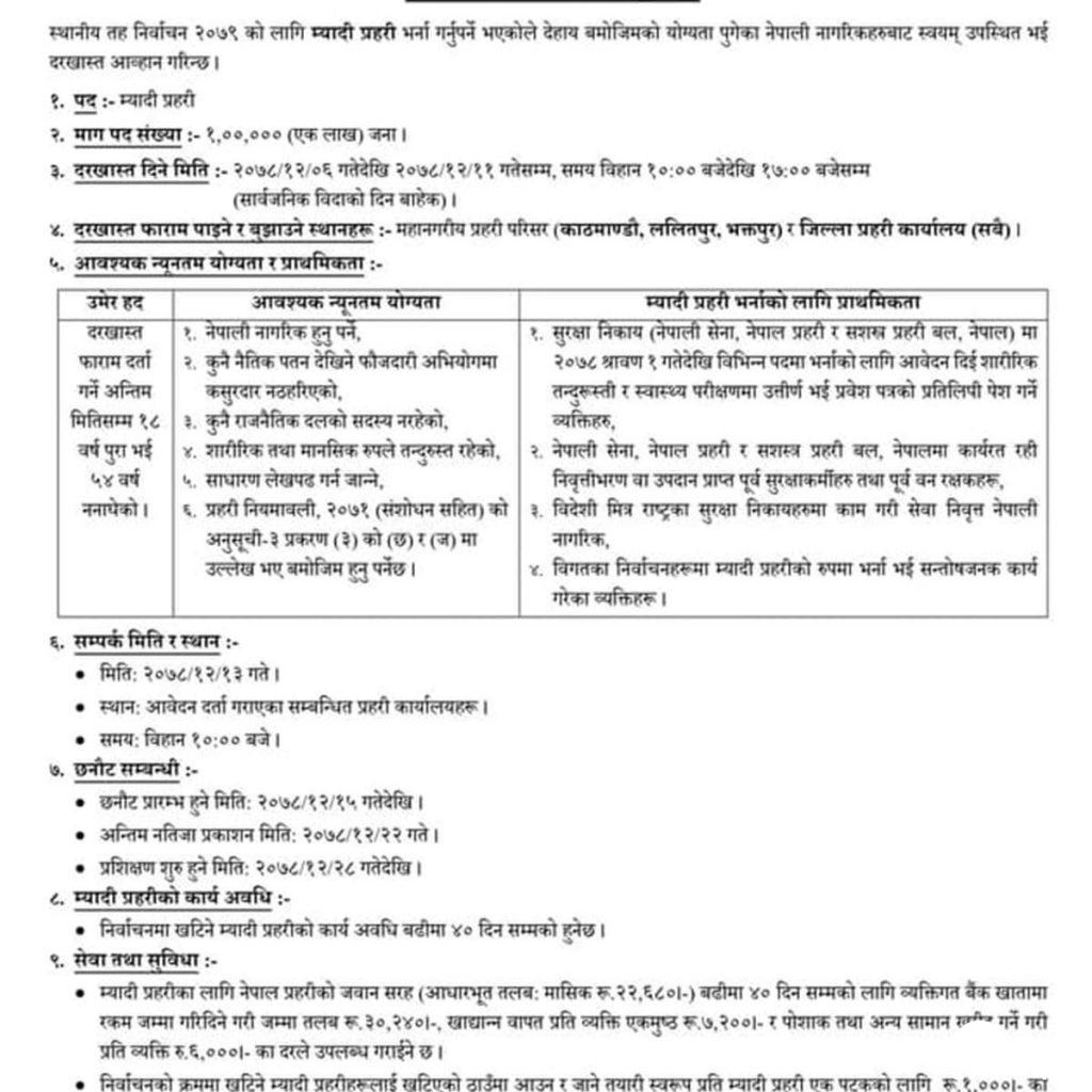 एक लाख म्यादी प्रहरीको भर्ना खुल्यो