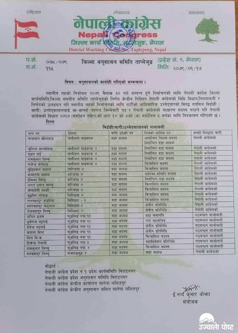 वागी उम्मेदवार दिएको भन्दै काँग्रेस ताप्लेजुङद्धारा एक महाधिबेशन प्रतिनिधि सहित २२ जना साधारण सदस्यबाट समेत निष्कासित