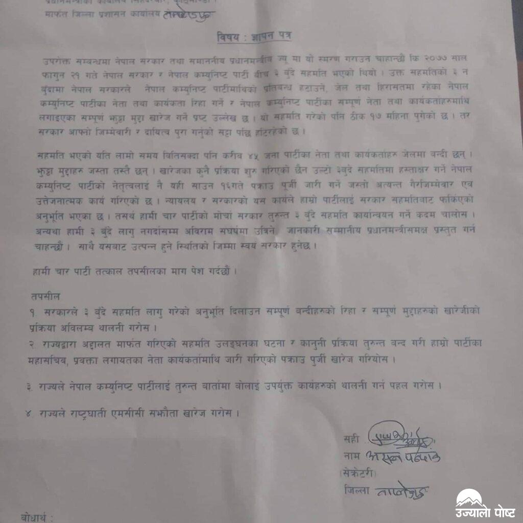 बुधवार जिल्ला प्रशासन कार्यालय ताप्लेजुङमार्फत नेपाल सरकारलाई ज्ञापनपत्र बुझाउँदै नेकपाले ‘सरकारले तत्कालै नेकपालाई तुरुन्त बार्तामा बोलाई उपयुक्त कार्यको थालनी गर्न पहल गरोस् भनेको’ छ । ज्ञापनपत्रमा राज्यद्धारा अदालतमार्फत गरिएको सहमति उल्लंघनका घटना र कानुनी प्रकृया तुरुन्त बन्द गर्न,पार्टीका प्रवक्ता,महासचिव लगायतका नेता कार्यकर्तामाथि जारी गरिएको पक्राउपूर्जी खारेज गर्न नेकपाले माग गरेको छ । जिल्ला सेक्रेटरी असल पन्दाकको नेतृत्वमा रहेको नेकपाको टोलीले प्रमुख जिल्ला अधिकारी महेशकुमार पोखरेललाई ज्ञापनपत्र बुझाएको हो । सेक्रेटरी पन्दाकद्धारा हस्ताक्षरित ज्ञापनपत्रमा २०७७ साल फागुन २१ गते नेपाल सरकार र नेकपाबीच भएको सहमति कार्यान्वयन गर्न सरकार समक्ष माग गरिएको छ ।