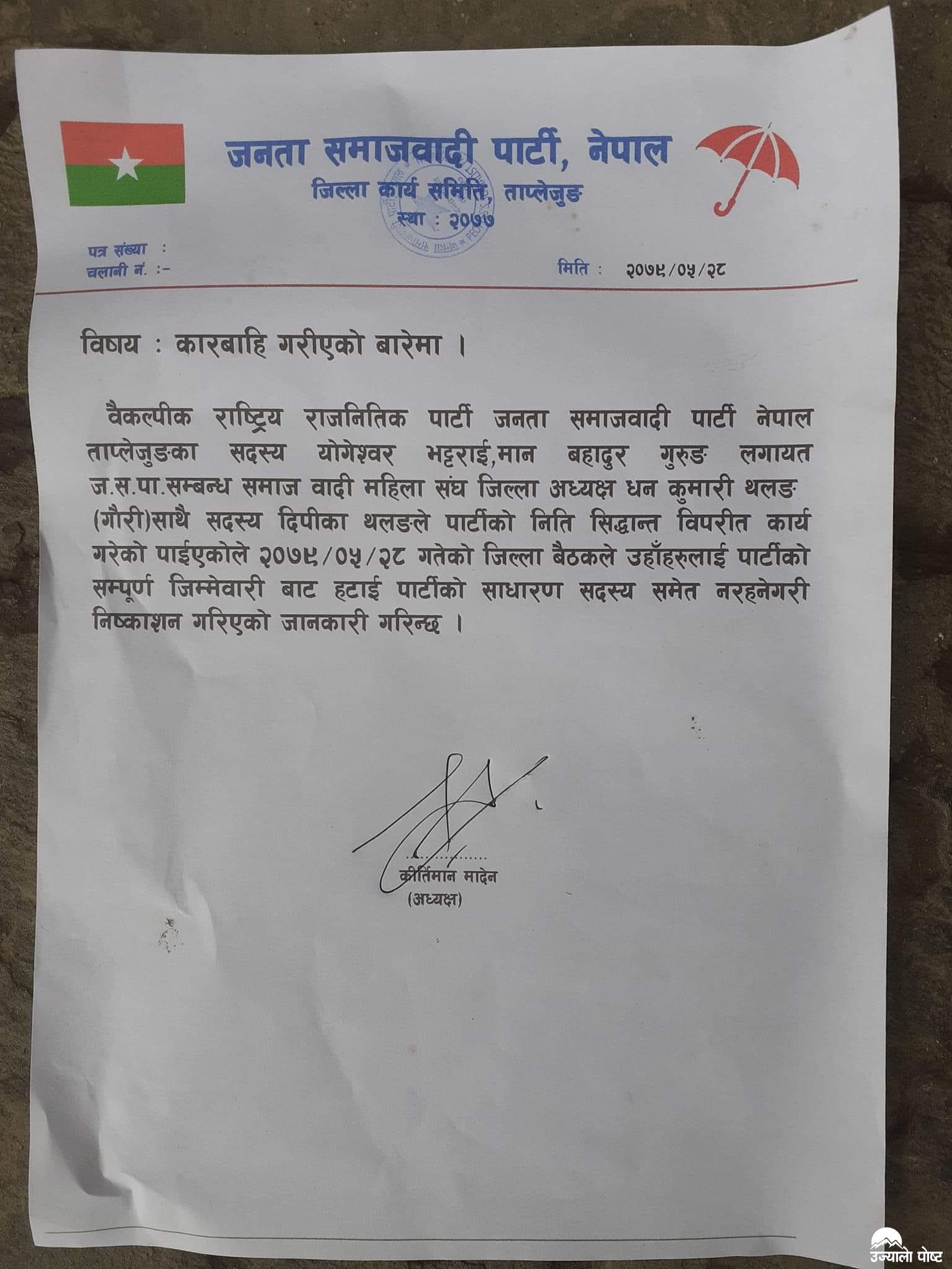 ताप्लेजुङ,भदौ २९ । पार्टीहित बिपरित कार्य गरेको भन्दै जनता समाजवादी पार्टी ताप्लेजुङले चुनावको मुखैमा चार जिल्ला नेतालाई साधरण सदस्य समेत नरहने गरी कारवाही गरेको जनाएको छ ।