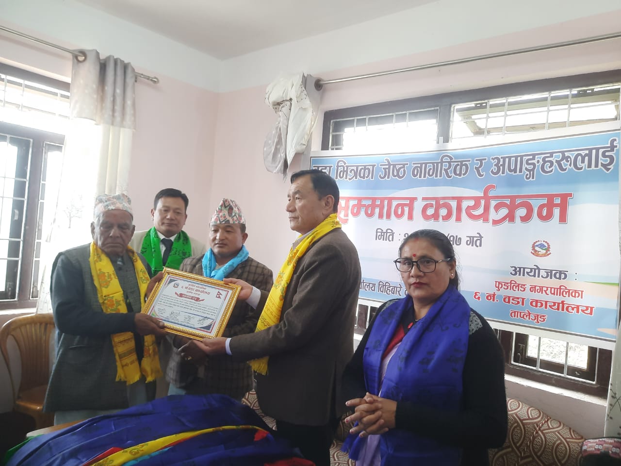 ताप्लेजुङ,बैशाख १७ । ताप्लेजुङको फुङलिङ नगरपालिका ६ नं वडा कार्यालयले वडाक्षेत्रका १ सय ४७ जना जेष्ठ नागरिक तथा अपाङ्गता भएका व्यक्तिलाई सम्मान गरेको छ ।