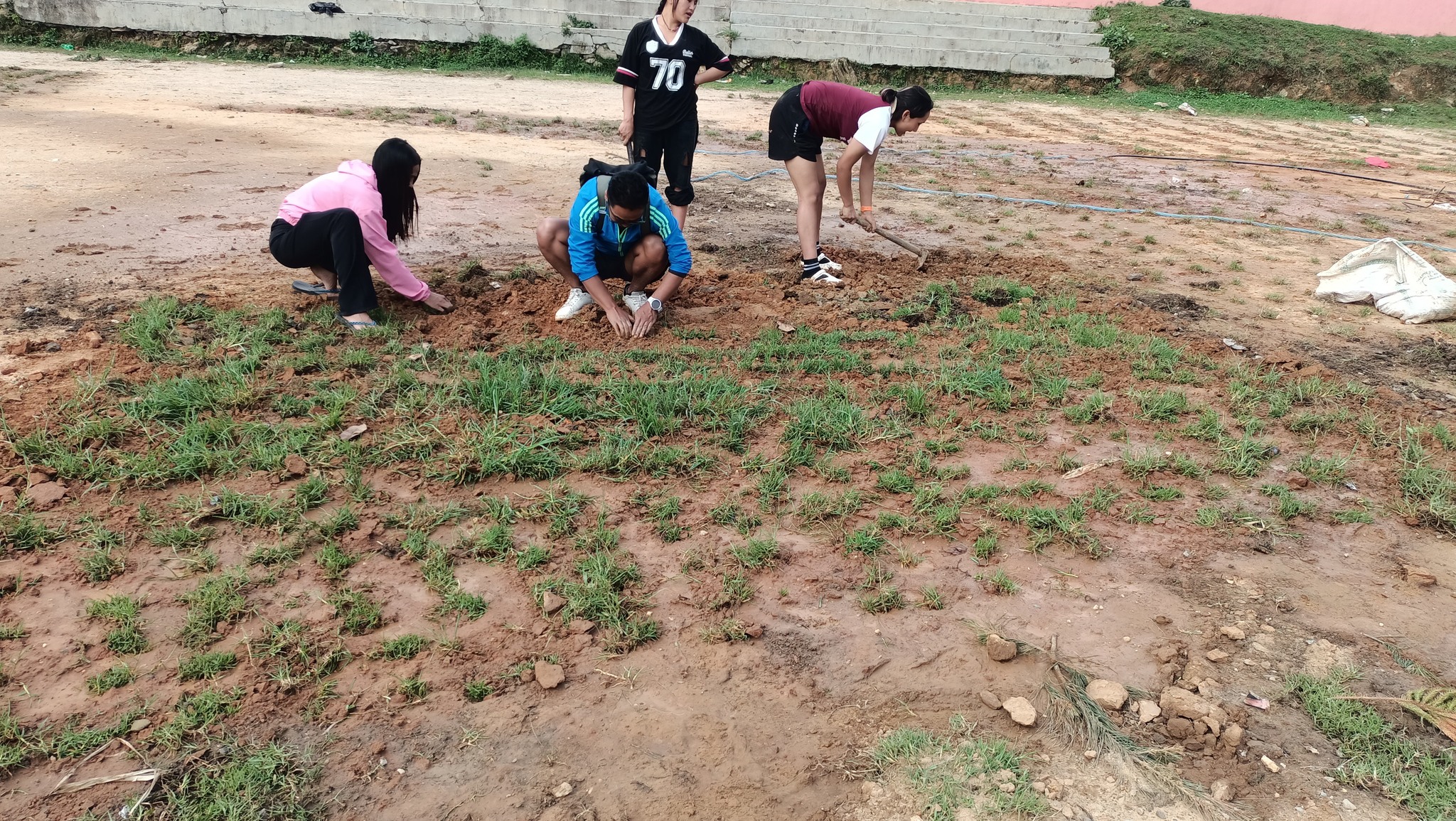 लाखेजात्राको अवसरमा हुने गोल्डकप प्रतियोगिताका लागि परीक्षणको रुपमा भानुजन माविको खेल मैदानमा दुबो रोपण कार्य हुँदै ।