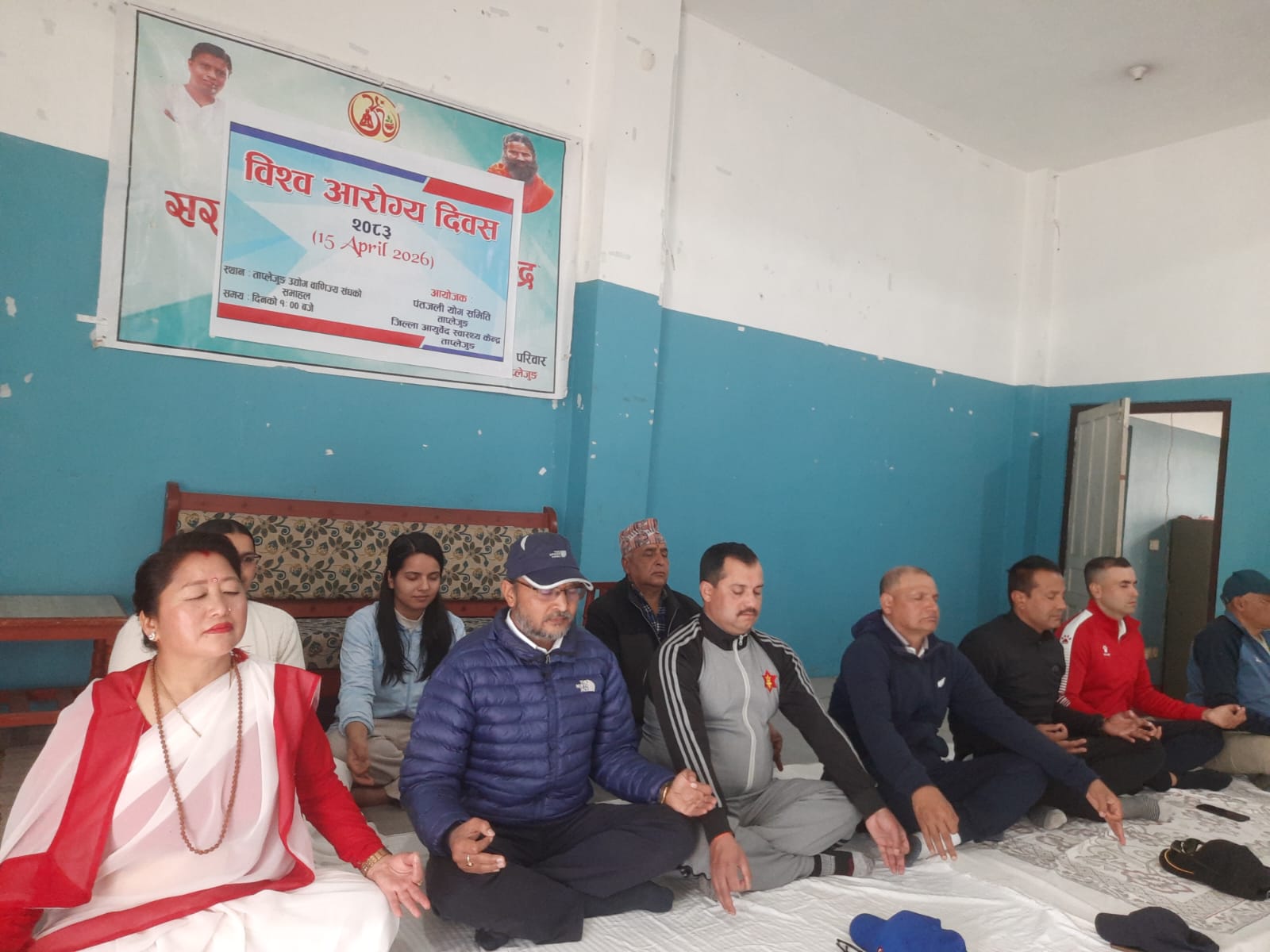 पतञ्जली योग समिति ताप्लेजुङ र जिल्ला आर्युबेद स्वास्थ्य केन्द्रको संयुक्त आयोजनामा अन्तराष्ट्रिय आरोग्य दिवस मनाईएको हो । ध्यान तथा योग पछि आयोजित यसको उद्देश्य तथा महत्व माथि प्रकाश पार्दै प्रमुख जिल्ला अधिकारी शिवराज सेढाइँले समग्र स्वास्थ्य,सुख र सन्तुलित जीवनशैलीका लागि ध्यान तथा योग महत्वपूर्ण हुने बताउनुभयो । पतञ्जली योग समितिका कोशी प्रदेश समिति सदस्य शान्ति मादेनले योग तथा ध्यान जीवनशैली सुधार र स्फुर्त शरीरका लागि महत्वपूर्ण हुने बताउनुभयो । लिटलबुद्ध बोर्डिङ स्कुलका प्रिन्सिपल युवराज गिरीले सुलभ स्वास्थ्य अभ्यास,निरोगिता र एकाग्र मनका लागि ध्यान तथा योग उपयुक्त माध्यम हुने बताउनुभयो ।