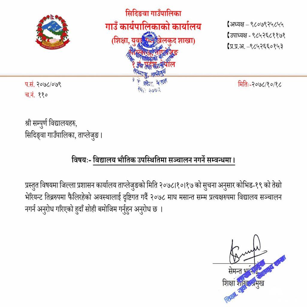 सिदिङ्वा गाउँपालिका, शिक्षा शाखा प्रमुख सेमन्त भट्टराईले मंगलबार सूचना जारी गर्दै पालिकाभित्रका सबै विद्यालयहरु आगामी माघ मसान्त सम्मलाई भौतिक उपस्थितिमा सञ्चालन नगर्न नगराउन उल्लेख गर्नुभएको छ । जिल्ला प्रशासन कार्यालय ताप्लेजुङलेसमेत विद्यालयहरु सञ्चालन नगराउन भनिएको हुँदा सोहीअनुसार सबै विद्यालयलाई विद्यालय नखुलाउन अनुरोध गरिएको भट्टराईले जानकारी दिनुभयो ।